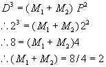 22. Find the combined mass of two stars in a binary system whose period of mutual revolution is two years, and for which the semimajor axis of the relative orbit is 2 AU.